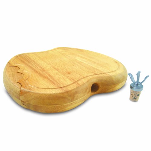 Picnic Time Apple 10-1/2-Inch Cheese Board/Tool Set This Picnic Time Apple cheese set is the ideal ensemble for your next cocktail party or buffet. This set features an apple-shaped cutting board, with a stem and leaves-shaped bottle stopper, along with three stainless steel cheese tools. The Apple measures 10-1/2 by 10 by 1-1/2 inches and is made of rubberwood, a hardwood recognized for its durability and beautiful grain. The metal alloy bottle stopper sits at the top of the board in its own nook. The pull-out drawer is designed to resemble a bite mark in the 'apple', and houses the three cheese tools inside: one double-edged hard cheese knife, one cheese fork, and one blunt-nosed soft cheese knife, all with handles made of dark resin-stabilized wood that is durable and beautiful to the eye. The Apple makes a lovely gift! Read more