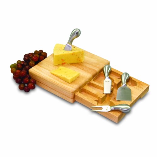 This Festiva cheese ensemble by Picnic Time features a mini cutting block, perfect for cutting cheese or fine foods. This board is made of rubberwood, a hardwood recognized for its rich grain and durability, and measures 7-3/4 by 8-3/4 by 2 inches. Below the cutting board is a pull-out drawer-style compartment that houses four brushed stainless steel cheese tools. The tools include one each: blunt-nosed soft cheese knife, hard cheese knife/spreader, chisel knife for hard crumbly cheese, and a cheese fork. The compact design of the Festiva allows for easy transport to the backyard, picnics, concerts, parties, or out to the boat. See all Picnic Time Festiva 8-3/4-Inch Cheese Board/Tool SetOverviewReview Rating :
